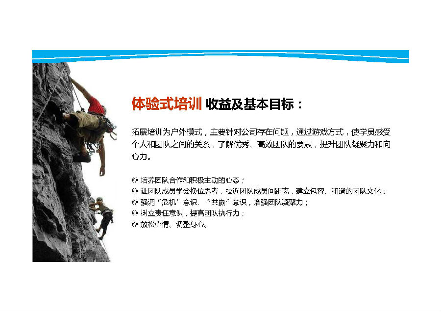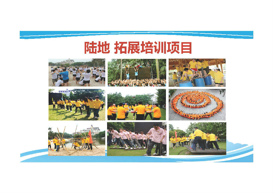 拓展训练英文为Outward Development,又称户外拓展训练(Outward bound),原意为一艘小船驶离平静的港湾,义无反顾地投向未知的旅程,去迎接一次次挑战,去战胜一个个困难。拓展训练通常利用崇山峻岭、瀚海大川等自然环境 [1] 。