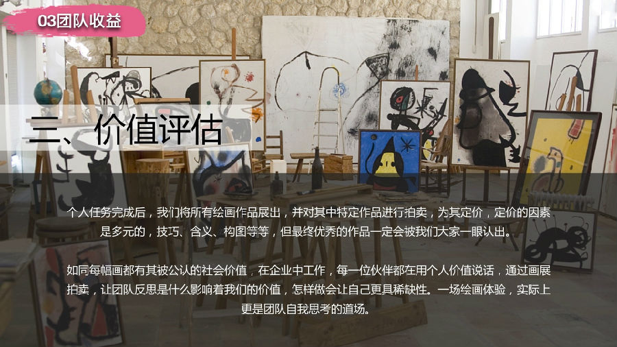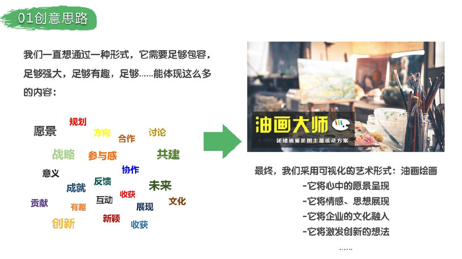 通过团队的努力完成一幅具有企业文化代表意义的油画,用视觉的感观直接呈现在面前,提升企业员工的企业归宿感,同时,在前期制作过程中,团队成员的相互协作,增进团队成员间的凝聚力.参与者要用画笔和颜料,挥洒艺术才能,绘出史诗般的巨幅画作。