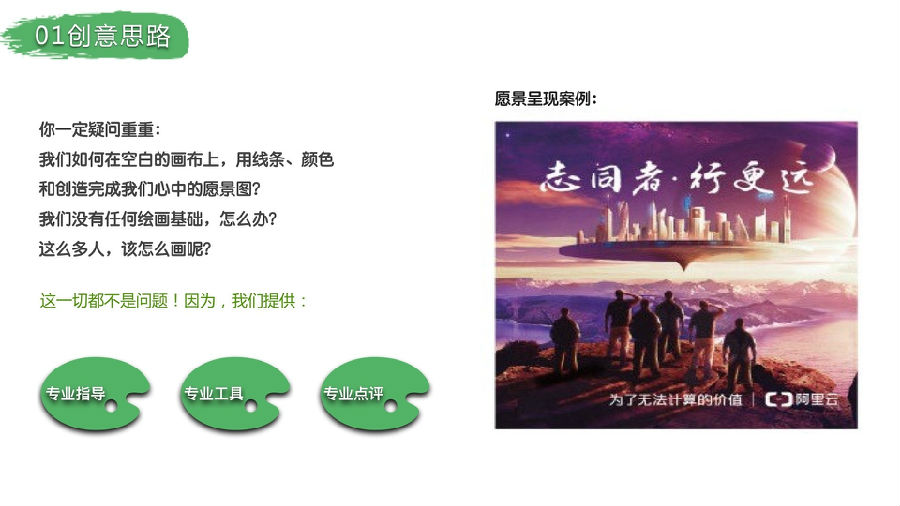 企业愿景是很难用语言去描述的事物!那么,我们换一种形式,用图画的方式呈现出来,也许,画画一直是从小就有的梦想,但是从来没有真正完成过自己的画作,这个,让你一圆夙愿。也许,很多人一开始从来没有想过自己的那幅画能有多大作用,但是,当最终的画作呈现在面前时,他会发现自己独一无二的特性。