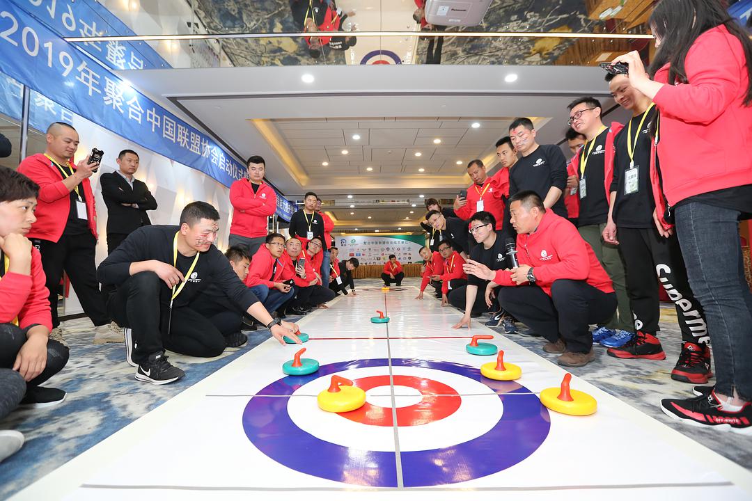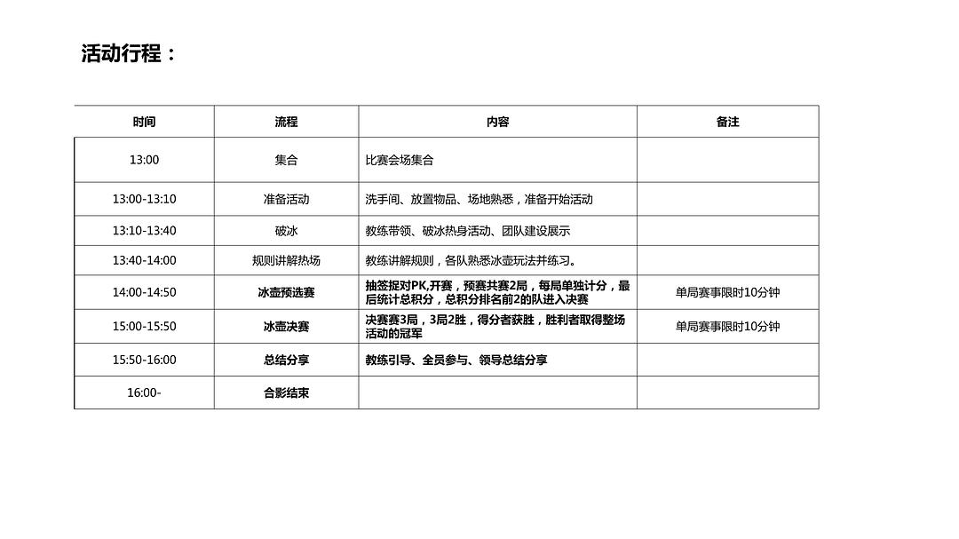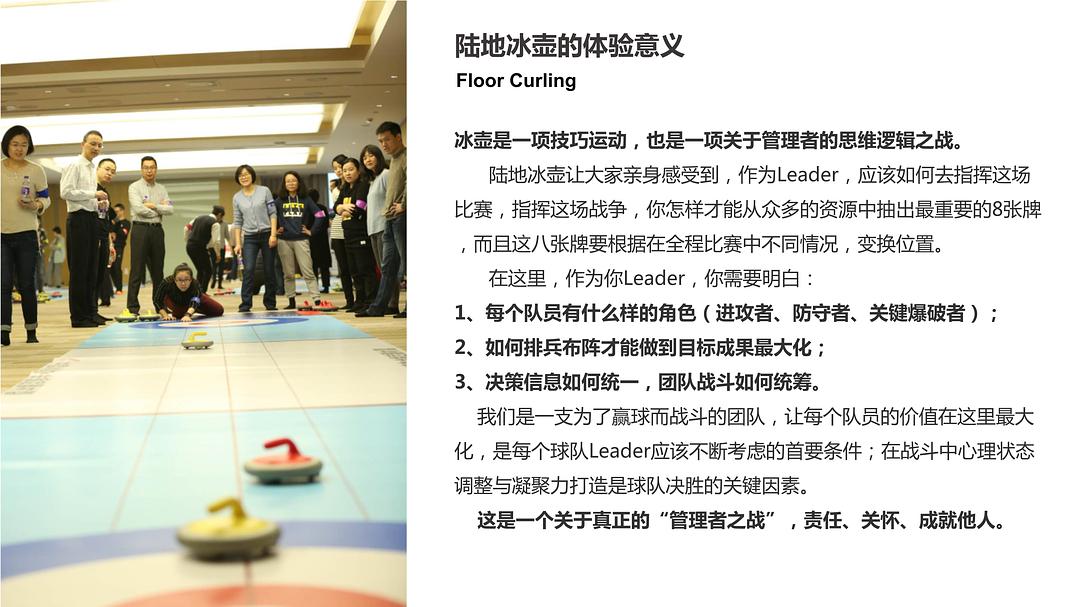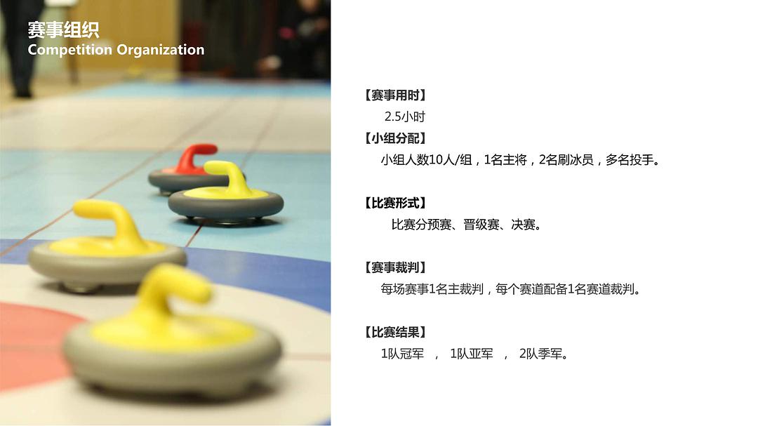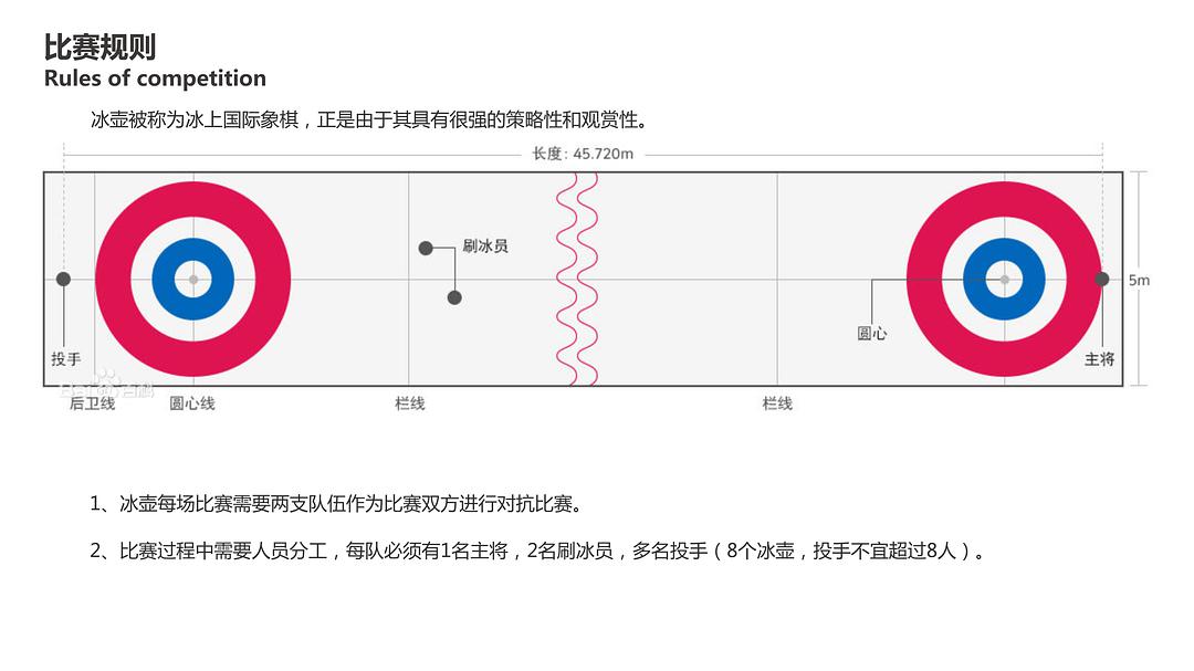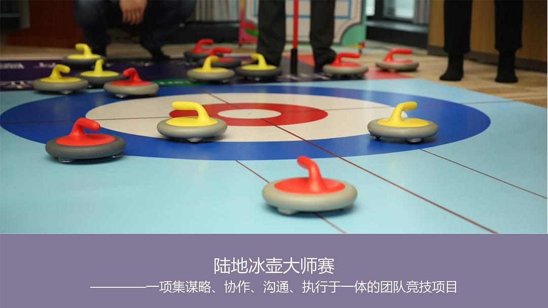闯越改良冰壶团建,比赛时,每场由两支球队对抗进行,每队由8名球员组成。比赛共进行5局。两队每名球员均有两个冰壶,即有两次掷球机会。两队按一垒、二垒、三垒及主力队员的顺序交替掷球,在一名队员掷球时,由两名本方队员手持毛刷在冰壶滑行的前方快速左右擦刷冰面使冰壶能准确到达营垒的中心。同时对方的队员为使冰壶远离圆心,也可在冰壶的前面擦扫冰面。球员掷球时,身体下蹲,蹬冰脚踏在起蹬器上用力前蹬,使身体跪式向前滑行,同时手持冰壶从本垒圆心推球向前,至前卫线时,放开冰壶使其自行以直线或弧线轨道滑向营垒中心。掷球队员在力求将冰壶滑向圆心的同时,也可在主力队员的指挥下用冰壶将对方的冰壶撞出营垒或将场上本方的冰壶撞向营垒圆心。最后当双方队员掷完所有冰壶后,以场地上冰壶距离营垒圆心的远近决定胜负,每石1分,积分多的队为胜。