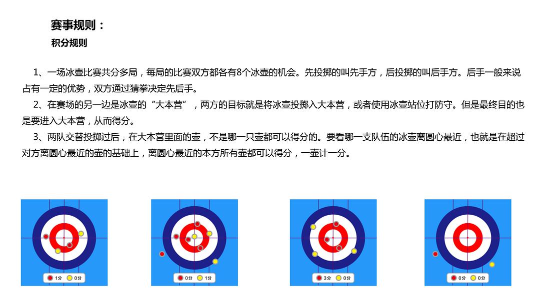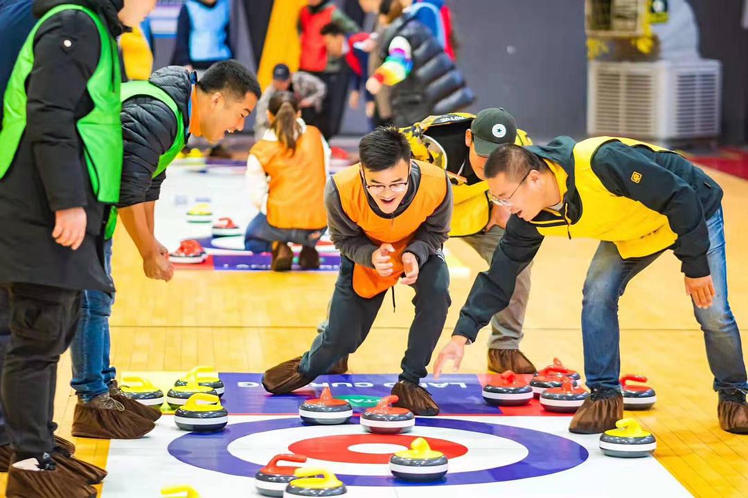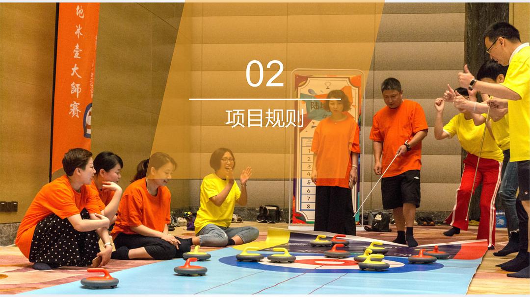 冰壶团建比赛分两队进行,两队各有四名球员,轮流丢掷石球(rock),以赛前双方掷点离圆心近者先掷。每局(end)在每队交替掷球,每人分别丢掷两球,八人共十六人