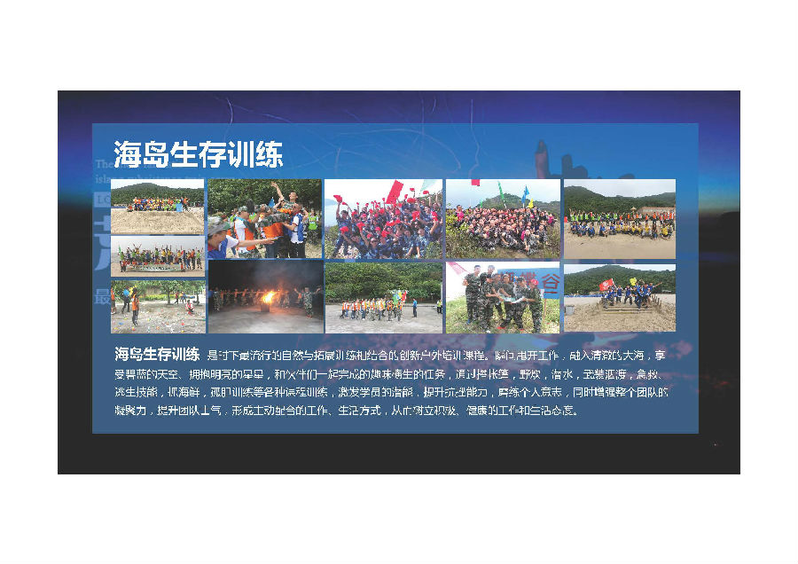 团队建设:突出“团队建设‘’的主题,在海岛竞争层面激发参与者的团队归属感与集体意识,提升参与者对于团队的认知心态,帮助参训者树立团队责任感和荣誉感。