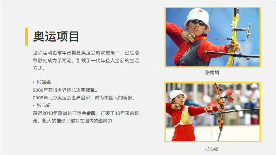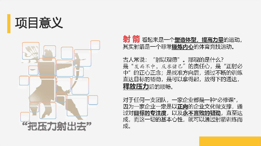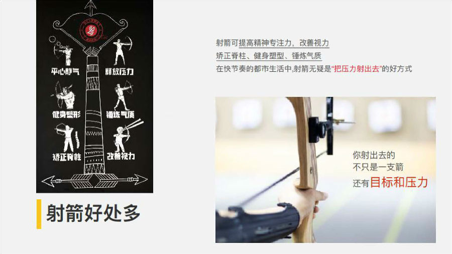 1.弓箭现在已经发展成为一种传统、一种文化,在军事领域,体育领域,弓箭都在广泛的运用。现代弓箭团建运动的发展更注重互动趣味、安全可靠、团队价值。。