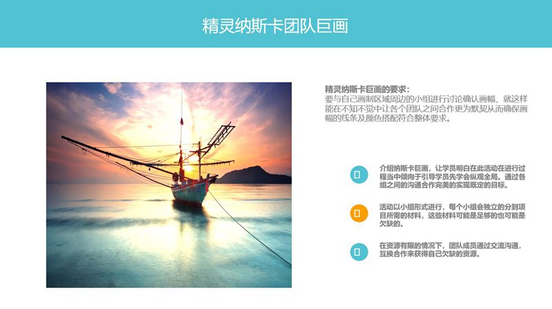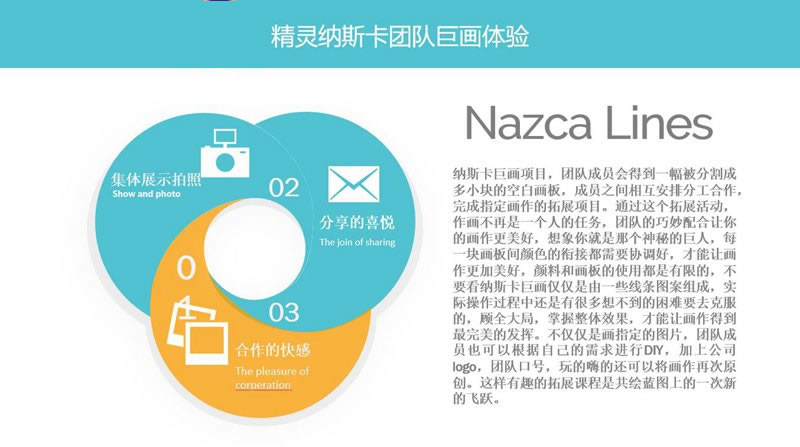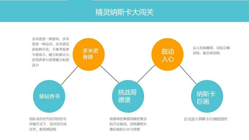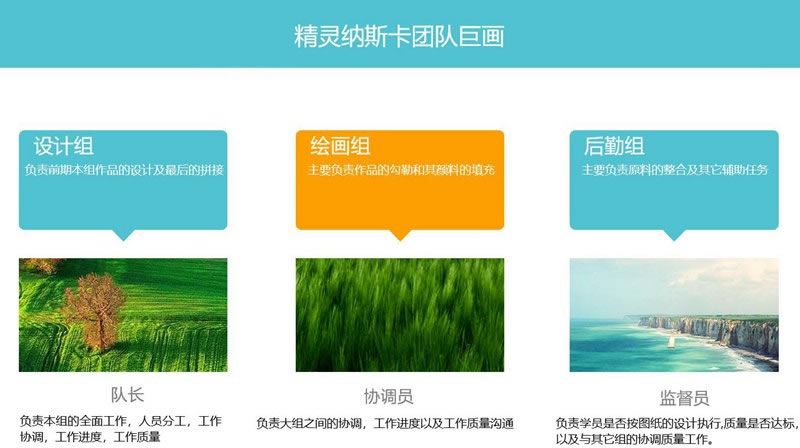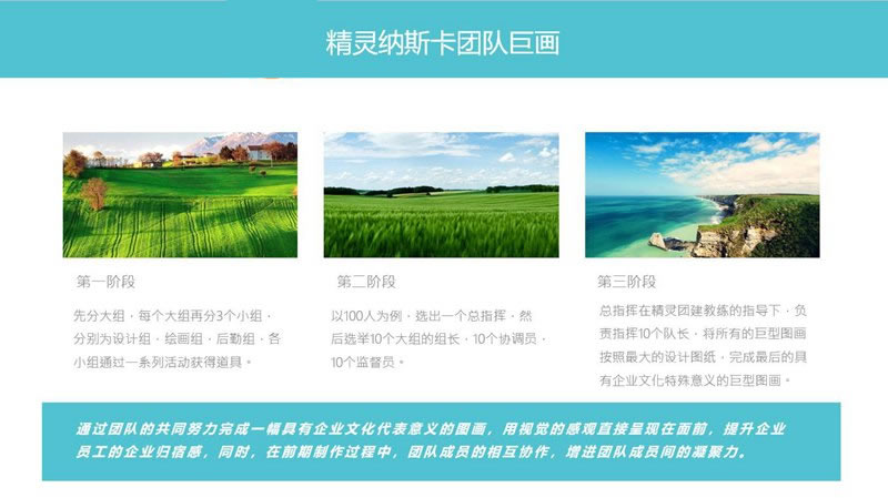 团队成员分成若干大组,每个大组下再分3个职能小组,分别为设计组(负责前期本组作品的设计及最后的拼接)、绘画组、后勤组(主要负责原材料的整合及其他的辅助任务);各小组通过一系列活动将会获得不同类型的道具,通过对各小样图重新设计和放大,完成一幅具有企业文化特殊意义巨型图画。